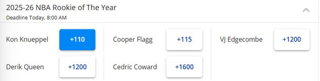 最佳新秀赔率更新后,克努佩尔(+110)升至第一,超越状元弗拉格(+115)。排在第3-5位的依次是探花秀埃奇库姆、13号秀奎因和11号秀考沃德。赛季至今,克努佩尔的表现非常出色,出战17场,场均19.4分5.8篮板2.9助攻,投篮命中率49.1%,三分命中率43.8%,罚球命中率90%。